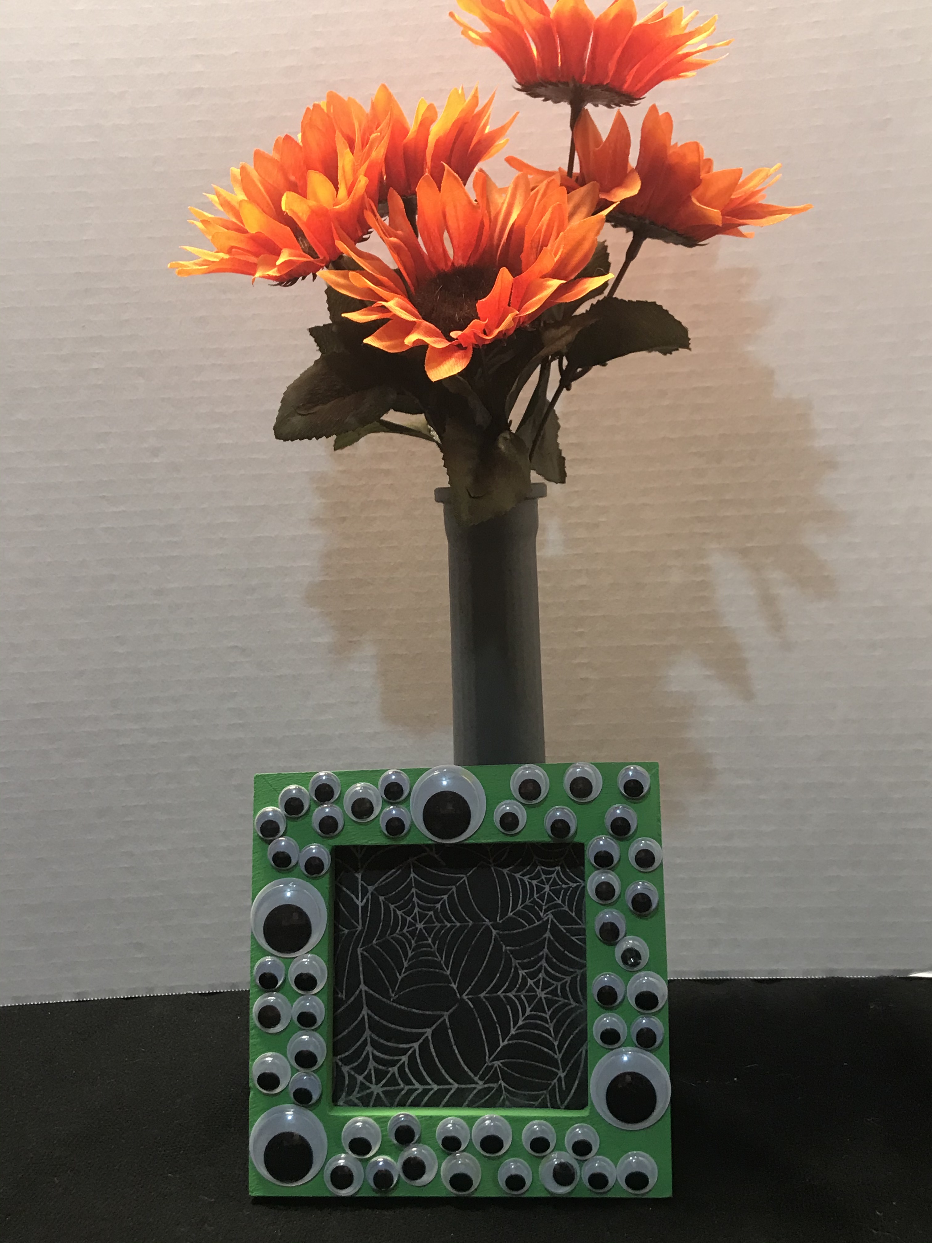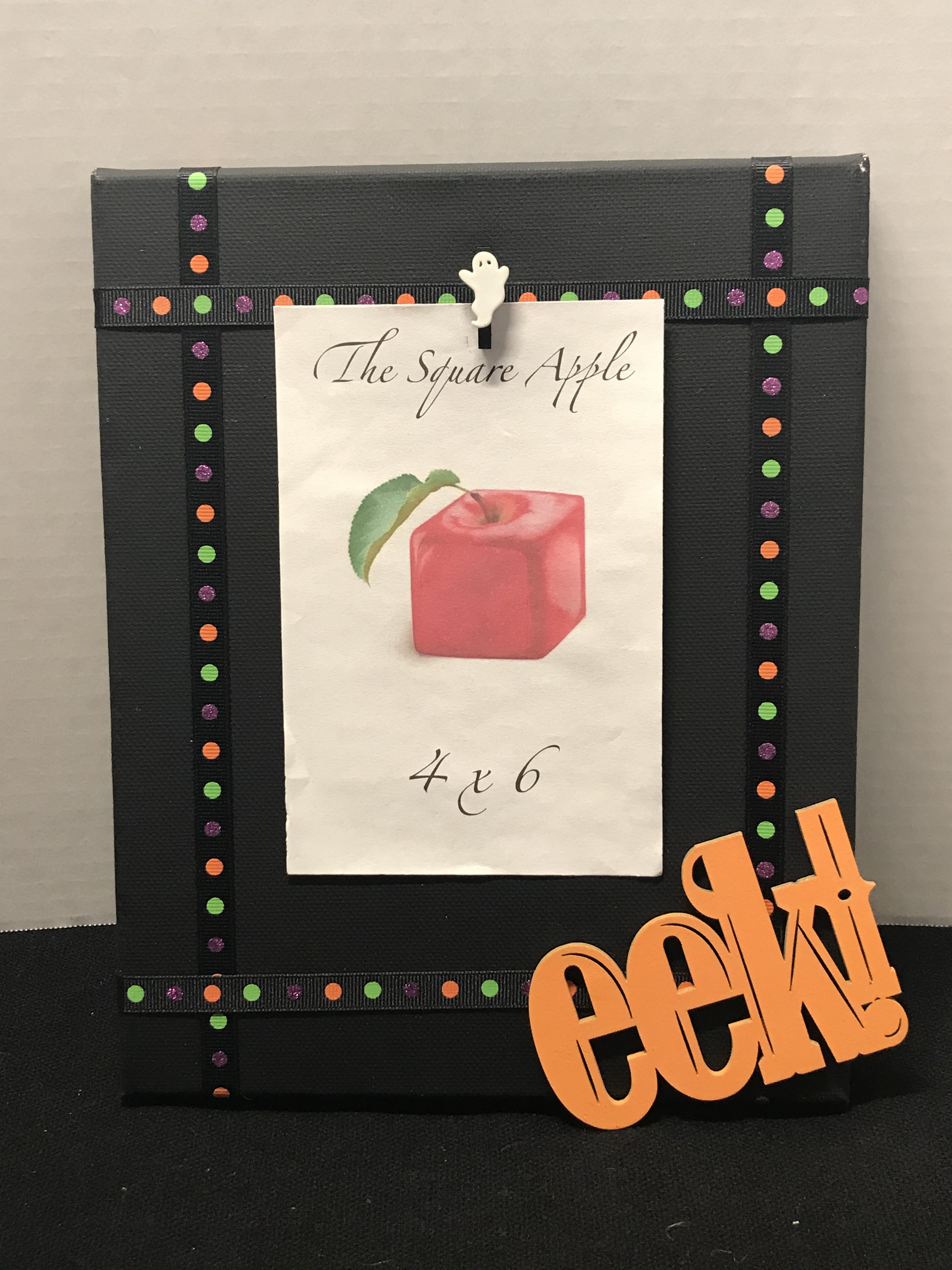 Canvas picture holder. Painted black and decorated with ribbon and wooden letters. Small clothes pin with a cute little ghost to hold the picture in place. There is a sawtooth hook on the back for wall hanging.