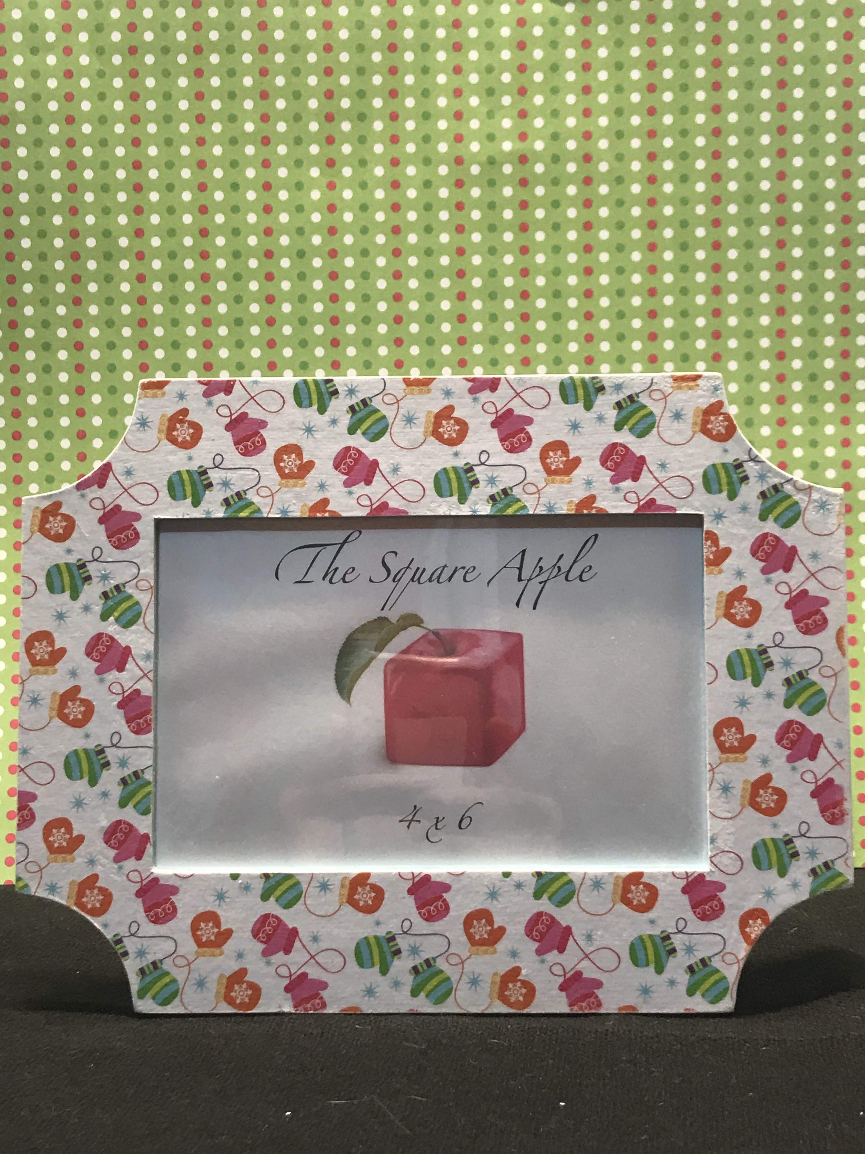 Painted wooden frame embellished with Christmas items. 4×6 opening (no glass) Made for table top display.