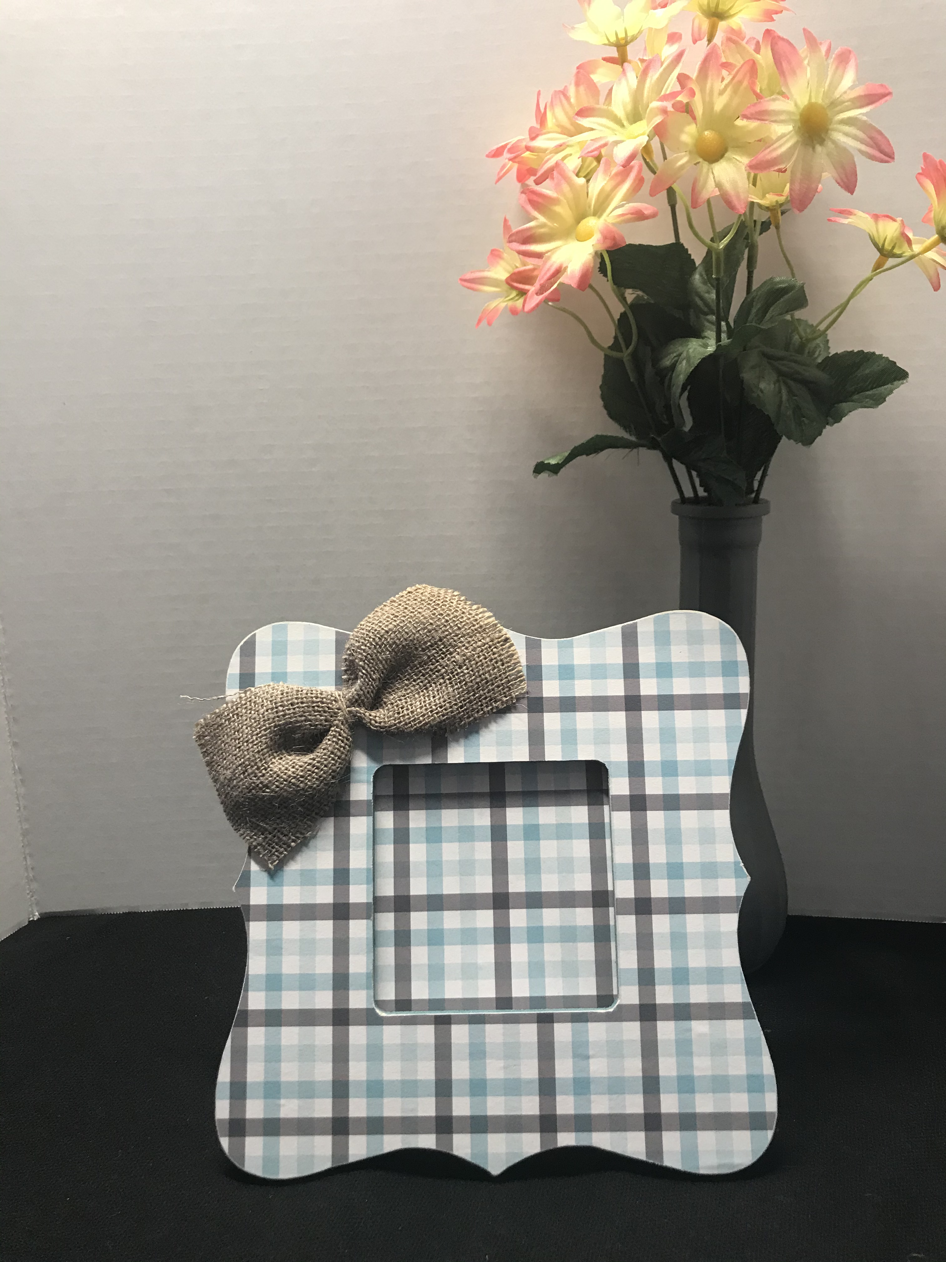 Blue and gray decoupaged wooden frame decorated with a burlap bow. Opening is 3×3. (no glass)