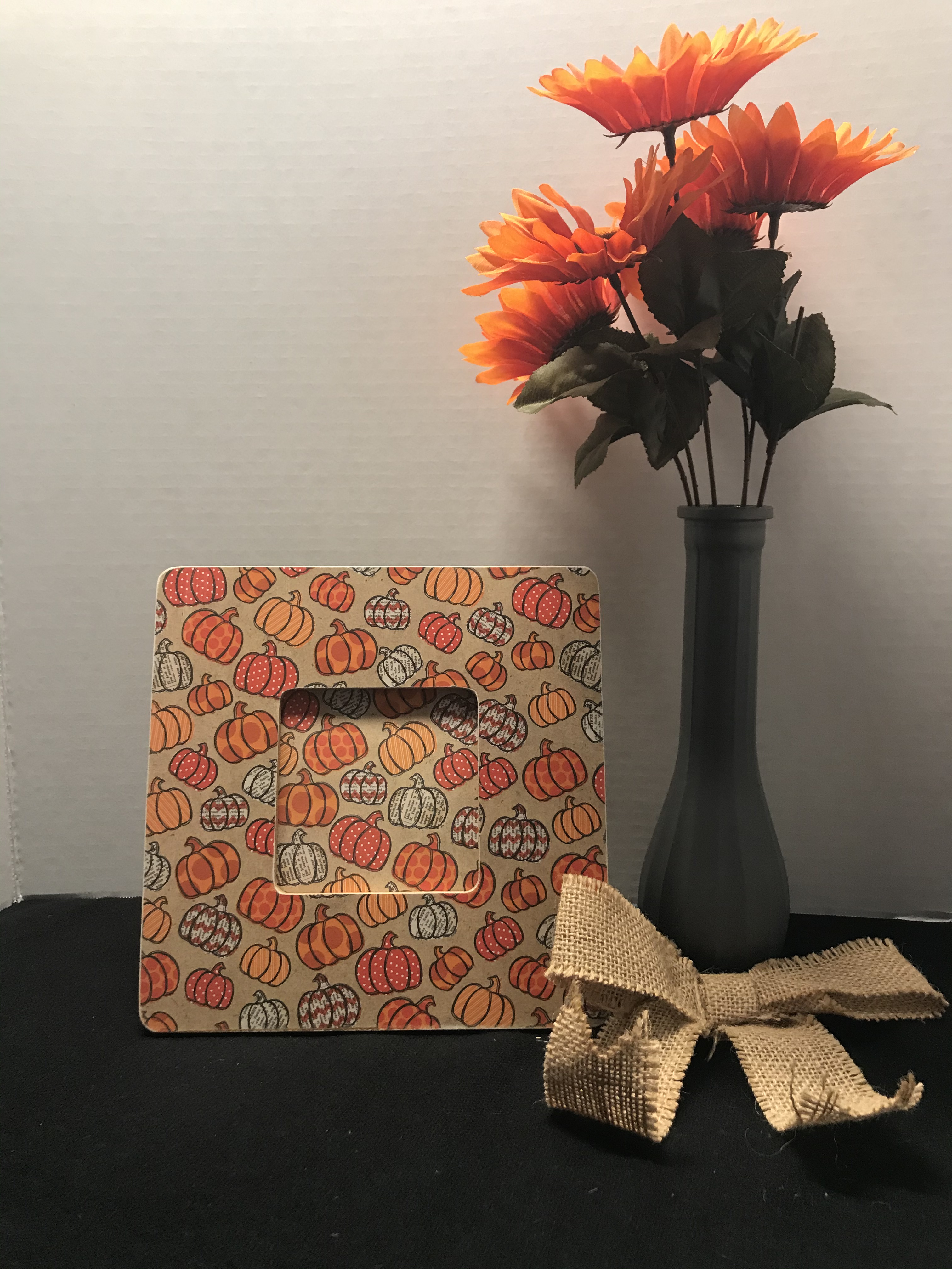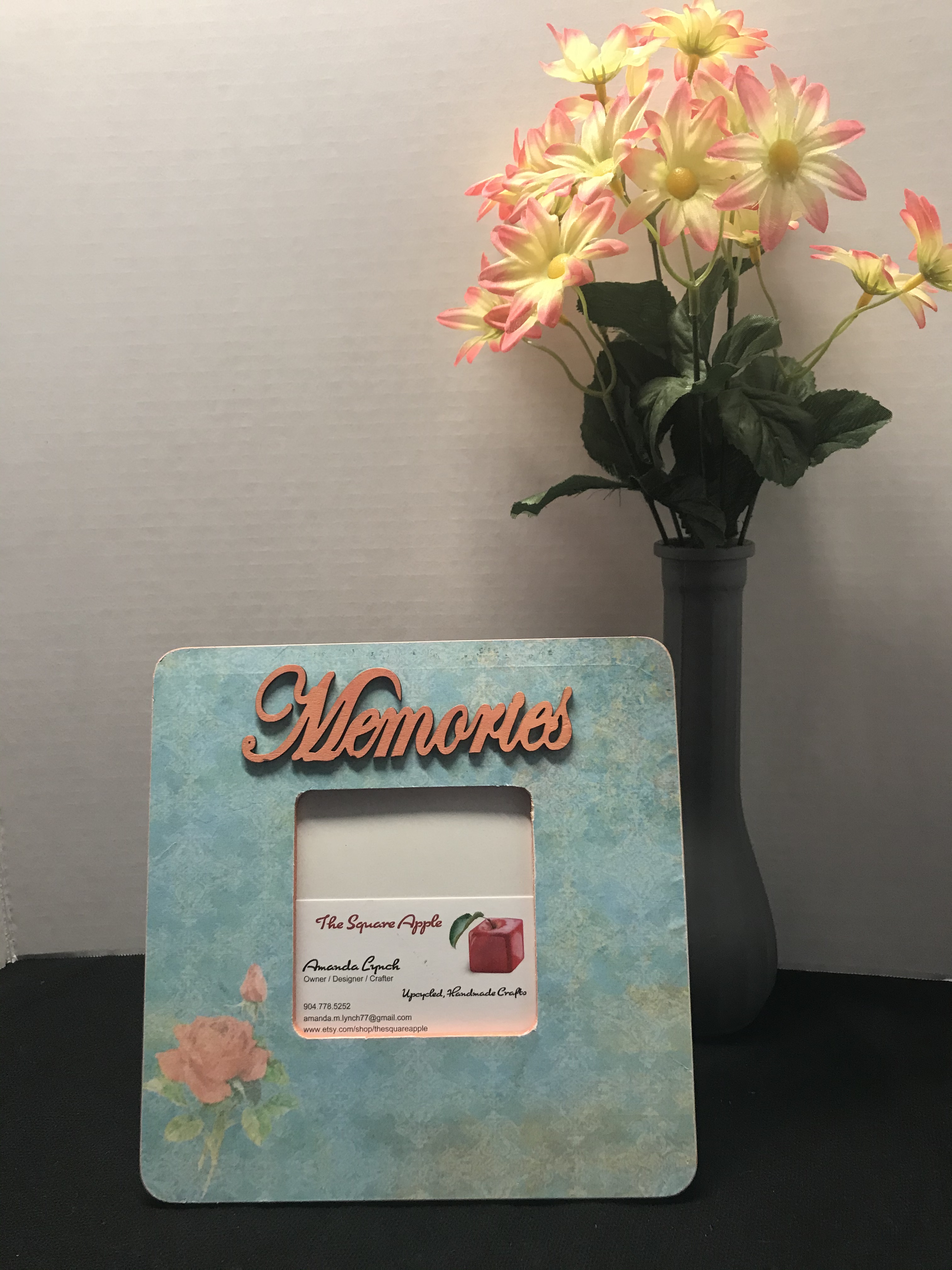 Wooden 3×3 Frame. This frame is decorated with decoupage. There is a small peg on the back for table top display. (no glass)