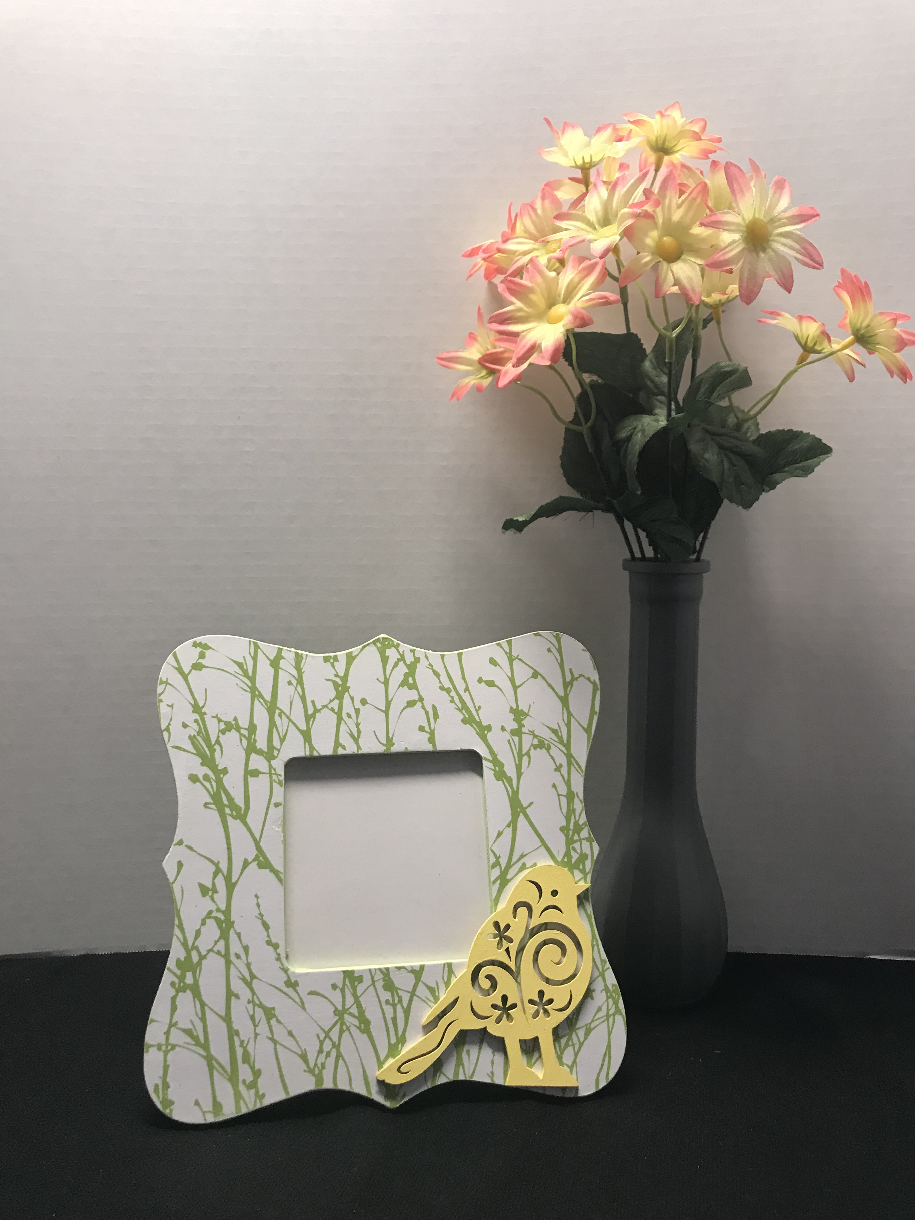 Decoupaged wooden frame with wooden yellow bird. Opening is 3×3. (no glass)